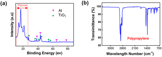 - Morent, R.; De Geyter, N.; Leys, C.; Gengembre, L.; Payen, E. Comparison between XPS- and FTIR-analysis of plasma-treated polypropylene film surfaces. Surf. Interface Anal. 2008, 40, 597–600. [Google Scholar] [CrossRef]