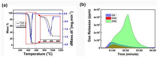 (a) TGA-DTG curve for the snack packaging plastics waste. (b) IR gas analysis for the gases emission from plastic waste at 1200 °C.