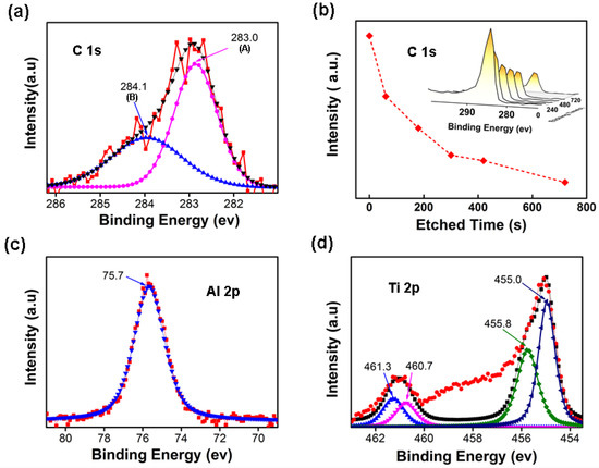 (a) C 1s spectrum for the carbon contained in the as-carburized steel; (b) relative carbon intensity against the depth (etched time) profile in the as-carburized steel. (c) Al 2p spectrum for the carbon contained in the as-carburized steel; and (d) the Ti 2p spectrum for the carbon contained in the as-carburized steel.