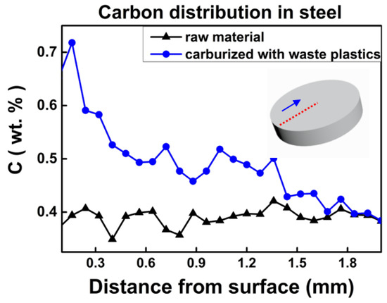 To accurately estimate the carburization effect of snack packaging plastic waste on steel, the EPMA technique was adapted to quantitatively investigate the accurate carbon content against the depth distribution on the as-carburized steel. As shown in Figure 6, the carbon content from the steel surface to the center of the as-carburized steel sample and the reference steel sample (raw material) were both analyzed by EPMA. It is obvious that the carbon distribution on the reference steel sample gives a minor fluctuation from steel surface to the center, averaging 0.39 wt. % with a standard derivation of 0.02 wt. %. This result is consistent with its bulk calibration carbon content (0.39 wt. %) and homogenous ferrite-pearlite microstructure as observed from OM and SEM studies. Different with the uniform fluctuation on the reference material, the carbon distribution on the as-carburized steel sample demonstrated a significant carbon gradient as given in Figure 6. The highest carbon content on the steel surface reached 0.72 wt. %, which approximates the carbon content of eutectoid steel [36] as discussed in the microscopy investigation section. Additionally, it can also be clearly seen that the carbon concentration higher than 0.55 wt. % has extended to a depth of 0.3 mm, giving a significant case surface with relatively higher carbon concentration in agreement with the microstructure observation mentioned above.