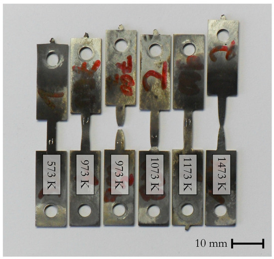 Flow stress curves of 22MnB5 were measured using a DIL805 A/D Dilatometer built by Baehr (Thermoanalyse GmbH, Huellhorst, Germany), shown in Figure 1. The specimens depicted in Figure 2 were cut out of the as-delivered sheet of 22MnB5 with 1.5 mm thickness by a water jet, and afterwards the coating was ground off. In the dilatometer, each specimen was induction-heated under vacuum to 1223 K within 180 s and soaked for 120 s. Following a Newtonian cooling law, the specimens were then quenched to 343 K with an average cooling rate of using argon gas. This temperature was held for another 120 s to allow some relief of residual stresses. Additional microsections and tensile tests proved that this initial heating and cooling cycle appropriately yields the desired martensitic microstructure in the specimens, and in turn resembles the presshardening process mentioned in the previous section.