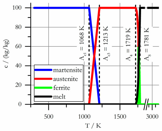 Using the software, the phase composition, as well as the physical properties of the pure phases during heating of the material, were computed. Afterwards, the physical properties of the temperature-dependent phase composition were computed from the properties of the pure phases by using the lever rule. The computed austenitization temperatures for a heating rate of are presented in Table 1. It can be seen that the transformation delay due to the heating rate is small compared to the temperatures stated by [24].
