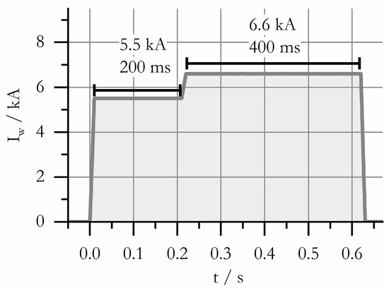The material data presented is well proven by comparing the results of a spot welding process FEA to measured results. A two-staged welding current as presented in Figure 4 along with a constant electrode force of was applied in both experiment and FEA. The experiments were carried out with a pneumatic spot welding gun with high-frequency direct current (HFDC) power source. With respect to the scope of this work, details on the experimental conditions, FE model and the entirety of its boundary conditions shall be examined in [29].