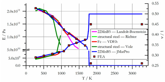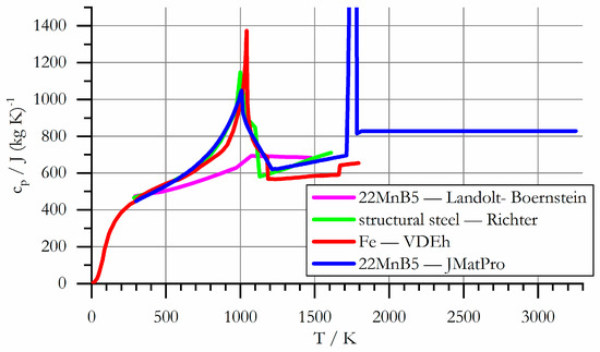 The data computed with Jmatpro was compared to data published by: Bungardt and Spyra (BaS) [25], Spittel and Spittel [18] (Landoldt-Boernstein), Richter [26,27], Shapiro [17], Verein Deutscher Eisenhuettenleute (VDEh) [23], Volz [28] and Wink and Kraetschmer [19]. From a chemical composition point of view, 22MnB5 is an unalloyed steel. Therefore, it is allowed to compare the order of magnitude of the computed data to data of similar unalloyed steels and pure iron, at least for the austenitic and molten phases. Accordingly, literature data on pure iron and a 23Mn6 steel were included in the comparison to ensure best verification of the data derived from Jmatpro. The data published by Volz [28] was collected from additional literature sources and is valid for structural steel. He used the data for FEAs of residual stresses resulting from arc welding and obtained very good conformity to his experimental verifications. Therefore, the data is considered to be sound.