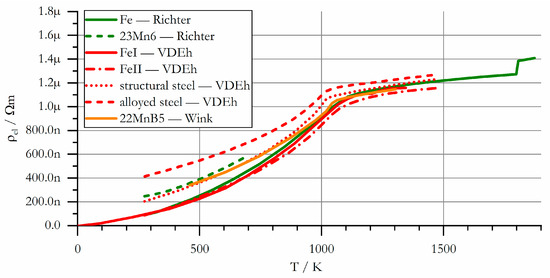 To improve readability, the specific electric resistance is drawn in two separate diagrams, shown in Figure 8 and Figure 9. Literature data on this property is particularly scarce. Jmatpro delivered data on the specific resistance only for . To fill the gap, additional data was generated based on the thermal conductivity using the Wiedemann–Franz (WF) law with a Lorenz number of as stated by [30]: