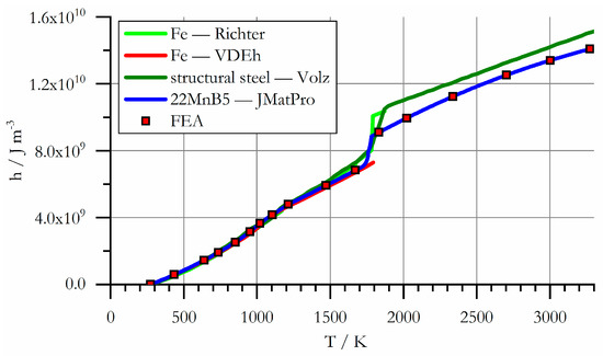 The specific heat capacity is a function of temperature with discontinuities at the Curie point, during austenitization, and at the melting point, as shown in Figure 11. At the mentioned transition points, the heat capacity is theoretically infinite. To avoid the discontinuities, the specific enthalpy density is used by the FEA following the relation