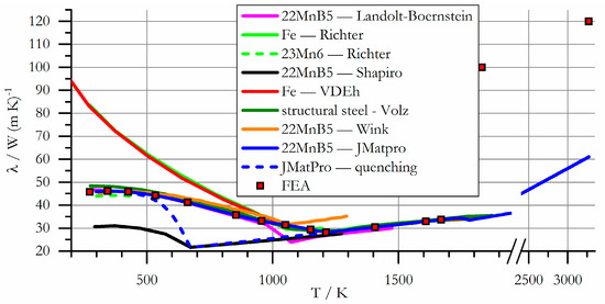 The specific thermal conductivity is initially reduced with increasing temperature, but increases again as soon as austenitization sets in, as shown in Figure 13. The data computed by Jmatpro is in good agreement with the experimental data. The curve published by Shapiro [17] apparently refers to the cooling of the material from the austenitic state. An additional curve computed by Jmatpro for quenching of 22MnB5 being drawn in Figure 13 strongly supports this. As computed by [31,32], a hydrodynamic mixing movement will occur in the molten pool during welding. In order to account for the resulting additional convective heat transport, the specific thermal conductivity of the melt is increased by about twice the magnitude at room temperature in this analysis.