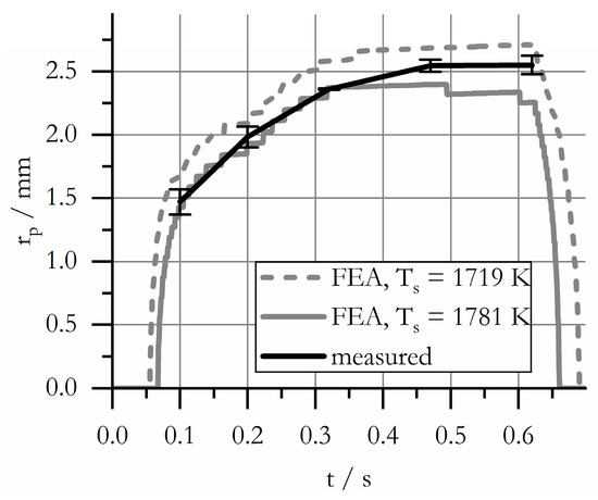 The computed molten zone represents the nugget shape visible in the macrosection reasonably well, although the computed nugget is slightly smaller. Quantitative examination of the nugget radius in Figure 15 gives more insight: In the FEA, a decision has to be made whether the temperature A4 or AS is considered to be sufficient to form a joint across the sheet metals’ surfaces. The experimentally observed nugget growth curve lies well in between both criteria. In Figure 14, melting is only assumed when the temperature AS is surpassed, which explains the seemingly too-small nugget in the picture. It shall also be noted that the computed electrode indentation depth and shape conform very well with the experiment. By comparison of the sheet thicknesses on the left border of Figure 14, it is assured that the relative scaling of FEA and the macrosection is correct.