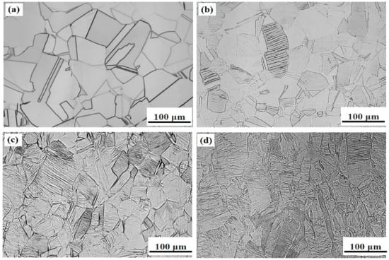 Optical micrographs showing the microstructure of specimens with different warm rolling reductions (a) 0%, (b) 20%, (c) 35%, (d) 55%.