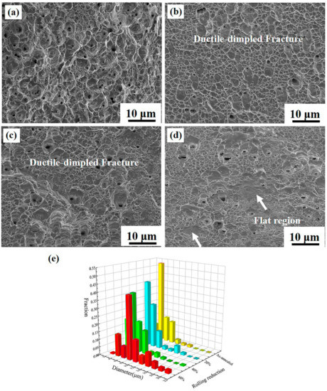 Characteristic features of the tensile fracture surfaces of the samples with different rolling reductions are presented in Figure 5. The fracture surface of the as-annealed specimen is the typical feature of ductile fracture by the presence of isometric dimples (Figure 5a). Furthermore, there are some flat regions marked with white arrows in Figure 5d, indicating failure due to grain boundary sliding in the 55% condition [32]. The corresponding dimple diameter distribution of samples at different rolling reductions is depicted in Figure 5e. Ductility is strongly related to the number density, depth, size, and distribution of dimples in the fracture surface [33]. It can be seen that different rolling reductions induce various distributions of the mean dimple diameter. In the specimen with rolling reduction of 20%, the mean size of ductile dimples is 3.52 μm, with a total elongation of 60%. In the specimen with rolling reduction of 25%, the size of ductile dimples is 5.69 μm, with an elongation of 44%. The size of ductile dimples in the specimen with rolling reduction of 55% is 8.24 μm, with an observed elongation of 20%. The mean size of the dimples increases, furthermore, the distribution of dimple dimensions exhibits a fluctuant trend with the increase of the rolling reduction, corresponding to the decrease in total elongation.