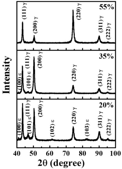 The XRD profiles for the warm rolled specimens with rolling reduction of 20%, 35%, and 55% after tensile fracture at room temperature are shown in Figure 6. It is interesting to note that the as-formed ε-martensite can be observed in the tensile fractured specimens with rolling reduction of 20% and 35%. However, no obvious diffraction peaks of ε-martensite can be identified from the XRD pattern with respect to the 55% rolled specimen after tensile deformation. This is indicative of the absence of deformation-induced ε-martensitic transformation at further tensile deformation condition, which may be ascribed to the derived high dislocation density.