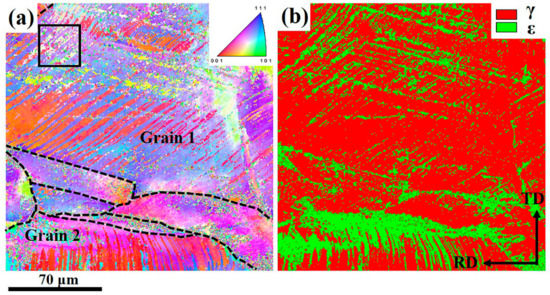Figure 7 displays the tensile deformation microstructure of the specimen with 35% rolling reduction. The RD orientation map and phase map are given in Figure 7a,b, respectively. With the OIM analytical software, the area fraction of ε-martensite is estimated to be 21%. As observed in those maps, there are two grains (Grain 1 and Grain 2) which contain clear ε-martensite with banded structures. Furthermore, deformation twins with various thicknesses ranging from 5–50 μm, as shown by arrows, are observed. The thickness of the twin indicates that some of those deformation twins are formed during tensile deformation. For analyzing the microstructure after tensile deformation in more detail, a small region taken from the framed area in Grain 1 is observed in a fine step size, as show in Figure 8.