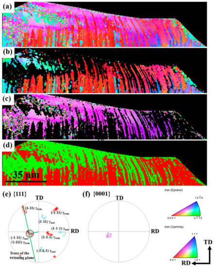 Figure 8b shows the RD orientation map for γ phase where the γ phases are colored depending on their orientation and ε phases are blacked out. In contrast, the colored and blacked out regions are inverted in ε orientation map (Figure 8c). The microstructure consists of γ matrix in purple, deformation twins in red, and some deformation induced ε-martensite in yellow (Figure 8a). The orientation of the γ matrix is determined at a scanning spot as ND//(20 4 −13), RD//(−2 −3 −4). It is observed that ε-martensite and the deformation twins with plate-like morphology are parallel to each other. Therefore, the primary (1 −1 −1)matrix plane is defined as the habit plane of ε variant and twinning plane of deformation twin, as shown in Figure 8e,f. With respect to the Schmid law, the most plausible shear direction is [−2 −1 −1], with a Schmid factor of 0.477. The analogous results can also be observed in Grain 2. The matrix with blue color with the crystal orientation of the miller indices ND//(−3 −15 7), RD//(3 −2 −3), is shown in Figure 9a. The parallel ε martensite and deformation twin are induced by the most plausible shear direction as [1 −2 −1] on the primary (−1 −1 1)matrix plane with a Schmid factor of 0.429. It should be noted that ε martensite and deformation twins are closely next to each other both in Grain 1 and Grain 2. Therefore, it can be speculated that ε martensitic transformation and twinning simultaneously operate during tensile deformation in the specimen with a rolling reduction of 35%.