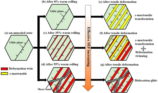 A schematic sketch of microstructure evolution during the warm rolling process and subsequent tensile deformation, exhibiting the mechanism of pre-strain twinning and ε-martensite transformation asynchronous deformation, is provided in Figure 10. In the as-annealed state, the microstructure consists of FCC γ matrix and quite a few dislocations (Figure 10a). The prior warm rolling results in the evolution of sub-structure, comprising dislocations, deformation twins and shear bands, depending on the warm rolling reduction (Figure 10b–d). It can be concluded that the deformation-induced ε-martensitic transformation is the single deformation mechanism that dominates plasticity, besides the dislocation glide, in a specimen without prior warm rolling (Figure 10e). However, ε-martensite and deformation twins form simultaneously when the prior warm rolling reduction reaches 35% (Figure 10f). Then, with further increasing warm rolling reduction to 55%, the deformation mechanism transits to dislocation glide (Figure 10g). The occurrence of this transition of deformation mechanism depends on effective SFE. It is well accepted that the ε-martensite occurs if the SFE is typically below 20 mJ·m−2, whereas deformation twins form when the SFE lies between 15 and 30 mJ·m−2 [8]. A higher SFE favors dislocation glide. Hence, ε-martensitic transformation and twinning occur simultaneously if the SFE is between 15 and 20 mJ·m−2. Meanwhile, an increasing dislocation density with the increasing warm rolling reduction is expected to enhance effective SFE. Therefore, the warm rolling reduction has a strong effect on the transition of the tensile deformation mechanism.