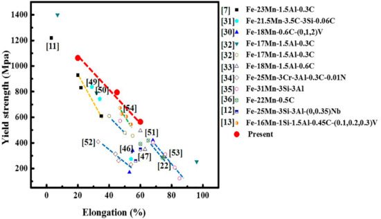 Figure 11 shows the resultant yield stress-ductility combination of Fe-30Mn-4Si-2Al TRIP/TWIP steel by prior warm rolling, together with the data from references [10,15,16,29,36,37,38,39,40,41]. First, previous reporting attempted to refine grain size to improve the yield stress by the conventional cold rolling and annealing treatment. This offer high ductility, but low yield stress (<500 MPa), as indicated by the blue dashed lines. Secondly, the precipitation strengthening strategy is one of the more efficient ways to increase yield stress. However, some precipitations formed at grain boundaries are harmful to toughness and ductility. Furthermore, the improvement of yield stress is limited by the addition of microalloy elements, as shown by the green dashed line. The third point to note in Figure 11 is that, comparing our results (red dashed line) with those by cold rolling (yellow dashed line), ductility is increased at any given yield stress. Therefore, this advantage of the present warm rolling strategy is especially pronounced at high yield strength toward 800 MPa and good ductility.