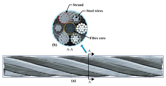 As shown in Figure 1, the 6×19+FC (fiber core) point contact wire rope was selected as the study object, which consists of 6 strands with 19 individual steel wires in each one and a rope core made of synthetic fiber. Steel wire rope is widely used in a winding hoist. The wires are manufactured by a cold drawing process from high quality carbon structural steel and the chemical composition of the wire material is 94.18% Fe, 4.53% Zn, 0.87% C, 0.39% Mn, 0.02% Si, 0.01% Ni, and other elements are S and P [36]. The detailed parameters of the steel wire rope are shown in Table 1.