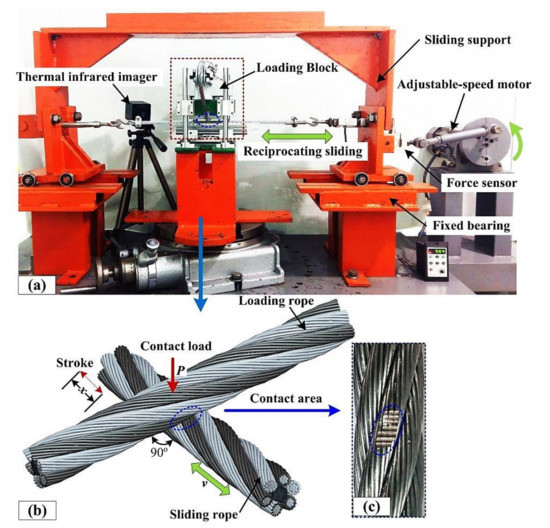 Therefore, the aim of this paper was to investigate the friction and wear characteristics of the wire rope sliding against itself at different stages. The effect of the stroke and contact load on the evolution of tribological parameters was also revealed. Additionally, the coefficient of friction (COF) and temperature rise during the friction tests were obtained through data collection system of the test rig and thermal infrared imager, respectively. Then, the wear debris characteristics were discussed. Furthermore, the wear scar distribution and the wear mechanism were analyzed using an optical microscope (Yongao Precision Instrument Co. Ltd., Shanghai, China) and scanning electron microscopy (SEM) (Mocai Materials Science and Technology Co. Let., Shanghai, China).