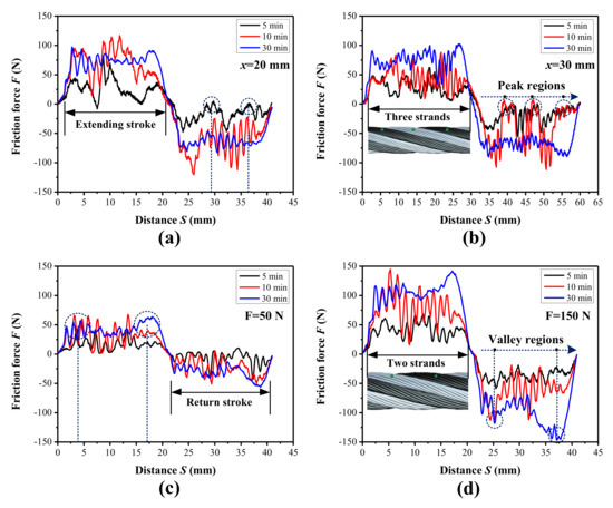 Figure 3 presents the friction curves of wire ropes for one cycle at different experimental stages, which correspond to the end of the different test stages. The stroke is 30 mm in Figure 3b, which is larger than the others. Thus, although the number of stroking cycles is the same, the sliding distance in Figure 3b is greater. The data of the extending stroke are positive values and negative values in the return stroke. It can be seen that the friction force is small at the beginning of the experiment and increases with the experimental time. Additionally, the fluctuation of the curves is large in the early stage, especially when the experimental time is 20 min. This is because the damage of the rope surface is mild and the contact area is small in the initial stage. The resistance is small and the sliding is smooth. Then, continuing the test, the wear depth becomes large and more wires and strands occur in the wear region. The sliding surface is no longer smooth. There are many gaps between the wires and strands in the wear region, which leads to a larger fluctuation during the reciprocating sliding in that stage, as shown in Figure 3 (red curves at 20 min). Furthermore, in the later stage, the surface wear is severe. The gaps are smaller in the wear depth and more debris fill the gaps in the wear scar region. The sliding surface becomes smoother and more regular along the sliding trace. Thus, the friction curves at an experimental time of 30 min are very smooth for each stroke. However, the gaps between the strands are much larger than those between the wires, which causes larger fluctuation in the process of reciprocating sliding. Furthermore, when the strand lay length is 70 mm, there are two and three strands in the wear region for the lower sliding rope when the stroke is 20 mm and 30 mm, respectively. Therefore, three obvious strong fluctuation regions appear on the friction curves in Figure 3b and two strong fluctuation regions in Figure 3a,c,d. However, because the sliding contact position and the test parameters are different for each curve, the larger fluctuations are not very obvious on all the curves. When the test time is 5 min in Figure 3a, the two peak regions appear at sliding distances of approximately 29 mm and 37 mm in the return stroke. For Figure 3c, the relatively obvious peak regions appear at distances of approximately 3 mm and 17 mm in the extending stroke, respectively. Two valley regions are very obvious on the curve when the test time is 30 min, as shown in Figure 3d. Moreover, as the stroke increases from 20 mm to 30 mm under the same contact load (100 N), the amplitude of the fluctuation on the curves in different stages becomes smaller. This means a larger stroke more easily causes a smoother sliding surface. Additionally, when the load is 50 N and the stroke is 20 mm, the change of the curves at different stages is small. Then, when the load increases to 150 N, as shown in Figure 3d, the change range of the curves becomes larger and the fluctuations are more obvious. This indicates that the wear is more severe and the surfaces are more irregular under the condition of a large contact load.