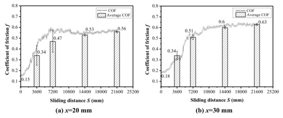 To explore the changing characteristics of the coefficient of friction under different strokes, the friction coefficient curves and the average values at different stages were obtained from the experiments with different test times, as shown in Figure 4. The curves were obtained from the experiments with a test time of 30 min. It can be seen that the coefficient of friction increases quickly when the sliding distance is less than approximately 7200 mm. Then, it shows a short period of slow change and finally becomes stable after approximately 14,400 mm. As shown in Figure 4a, the coefficient of friction increases from approximately 0.15 to approximately 0.56 as the sliding distance increases from 0 to 21,600 mm. Furthermore, with the stroke increase to 30 mm, the coefficient of friction increases from approximately 0.18 to approximately 0.63 with the sliding distance. The values in the relatively stable stage are greater than those in Figure 4a. Additionally, the increase of the curve in Figure 4b is faster and the amplification is larger before the sliding distance of 14,400 mm. This indicates that it is harder for the coefficient of friction to reach a relatively stable stage when the stroke is larger. Moreover, the difference between the average COF and the values on the curve is larger in the early stages and very small at the relatively stable stage. This means the characteristics of the friction pairs of the wire rope are diverse and random at the beginning of the experiments. Then, as the friction becomes stable, the friction pairs show more similarities between the different experiments.
