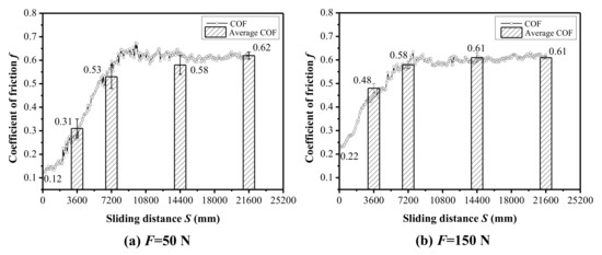 - The evolution of the COF can be divided into a rapid-increase stage (before 7200 mm) and a relatively stable stage (after 14,400 mm). The COF increases from approximately 0.48 to 0.61 with the sliding distance when the contact load is 150 N, which is the most rapid growth.