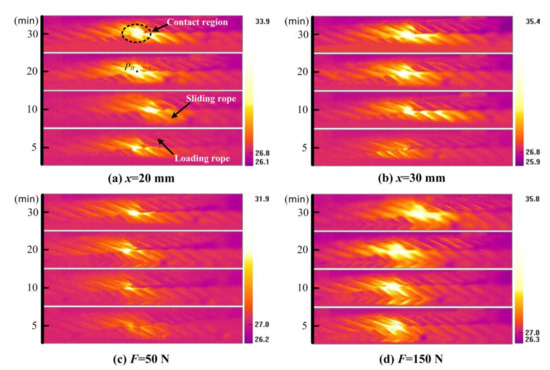 Infrared thermograms of contact wire ropes at different stages. (a) Stroke: 20 mm, load: 100 N; (b) stroke: 30 mm, load: 100 N; (c) load: 50 N, stroke: 20 mm; (d) load: 150 N, stroke: 20 mm.