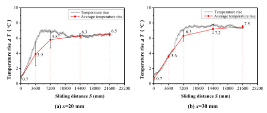 To make a quantitative analysis of the friction temperature rise of the wire ropes, the maximum temperature rise in the wear region was calculated by the thermal infrared imager with a measurement error of 2% of the measuring temperature. The evolution of the temperature rise under different strokes is presented in Figure 7. It is clear that the average temperature rise increases from approximately 0.7 °C to approximately 6.5 °C as the sliding distance changes from 0 to 21,600 mm when the stroke is 20 mm. Additionally, the evolution of the temperature rise curves is similar to that of the COF. The temperature rise increases rapidly before 7200 mm and reaches the relatively stable stage after approximately 14,400 mm. This indicates that the COF and temperature rise of the wire rope depend on the characteristics of the wear surface. In the early stage of the experiment (before 7200 mm), the contact area of the wire rope is small and the surface is more easily damaged. Thus, the contact area increases quickly and leads to rapid growth of the COF and temperature rise. However, the contact pressure will become small with the increase of wear scar. Then, the friction reaches the relatively stable stage gradually with the sliding distance. Furthermore, as the stroke increases to 30 mm, the evolution process is similar to that in Figure 7a, with a large and relatively stable average temperature rise of approximately 7.5 °C.