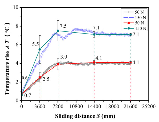 Figure 8 shows the variation of the temperature rise under different contact loads. It is clear that the contact load plays an important role in temperature rise of the wire rope. The average values increase from approximately 0.7 °C to approximately 4.1 °C with the sliding distance when the contact load is 50 N. However, as the contact load changes to 150 N, the temperature rise increases from approximately 0.6 °C to approximately 7.1 °C with the sliding distance. The values in the relatively stable stage are much larger under this condition. Additionally, the sliding distance for the rapid growth stage is similar (approximately 7200 mm) and it reaches the relatively stable stage faster under a small contact load. Therefore, the contact load can influence the variation range of the temperature rise at different stages, but the effect of the load on the variation tendency is small.