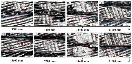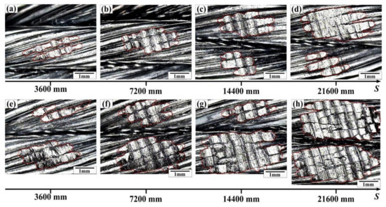 After all the friction and wear tests, the wear characteristics of the upper loading ropes were analyzed. Figure 9 presents the optical micrographs of the wear scars caused by the experiments with different sliding distances and contact loads. The evolution of the wear region with increasing sliding distance clearly appears. When the stroke is 20 mm, as shown in Figure 9a–d, the wear scar region is small before the sliding distance of 7200 mm, and the region is larger after 14,400 mm. Additionally, the wear is mild and the region is distributed on two strands when the sliding distance is 3600 mm. The wear area on one strand is divided into three parts by the gaps between the outer wires because of the low wear depth. Then, with the increase of sliding distance, the depth and area become larger, especially when the sliding distance changes from 7200 mm to 14,400 mm, and the growth of the wear scar becomes very obvious. This indicates that the wear is severe during this stage. Furthermore, in the relatively stable stage, there are two types of distribution for the wear scars and the surface wear is severe, as shown in Figure 9c,d. The wear region is distributed on two strands and the surface is relatively regular when the sliding distance is 14,400 mm. Another type is shown in Figure 9d; the wear concentrates on one strand and the surface is irregular, which is composed of many grooves caused by the wires. Moreover, the variation of the wear surface under a stroke of 30 mm is more obvious, as shown in Figure 9e–h. There are only two wires in the wear region and the surface is smooth when the sliding distance is 3600 mm. When the sliding distance increases to 7200 mm, the wear region contains four wires and the surface is rough. Further, as the distance changes to 14,400 mm and 21,600 mm, the wear on the rope surface becomes very severe. The broken wires appear clearly in the wear region. Therefore, the wear scar of the wire rope is constantly changing with the increase of sliding distance and the growth rate is different at different wear stages. The value is larger before the sliding distance of 14,400 mm. Moreover, the wear is more severe under a larger stroke.