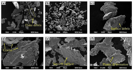 Scanning electron microscopy (SEM) micrographs of the wear debris with different magnifications. (a,d) ×100; (c–e) ×500; (f) ×1000.