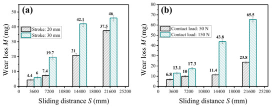 To quantitatively analyze the wear process of wire ropes, the mass of debris produced by each experiment was measured. Figure 12 shows the variation of the wear mass loss with the sliding distance under different conditions. Figure 12a presents the evolution of the wear loss under different strokes. It increases from approximately 4.4 mg to approximately 37.5 mg with the sliding distance changing from 3600 mm to 21,600 mm. Additionally, the wear loss increases from approximately 6 mg to approximately 46 mg with the sliding distance when the stroke is 30 mm. It is clear that values are similar at the sliding distance of 3600 mm, but the difference becomes much larger (more than twice) as the distance increases to 7200 mm and 14,400 mm when the stroke is 30 mm. Furthermore, the wear loss increases rapidly between the distance of 7200 mm and 14,400 mm, from approximately 19.7 mg to approximately 42.1 mg. This means that for a larger stroke, wear debris is more easily produced and the growth is more obvious with the sliding distance. Moreover, the variation of the wear loss under different contact loads is shown in Figure 12b. The increase range is small for the load of 50 N (from approximately 6.8 mg to approximately 23.8 mg). As the load changes to 150 N, the wear loss increases from approximately 13.1 mg to approximately 65.5 mg. The variation is very obvious after the sliding distance of 7200 mm. Furthermore, the change is small as the sliding distance increases from 3600 mm to 7200 mm. This indicates that the wear loss is low and the increase is slow in the early stage of the experiment and the values are much larger in the relatively friction stable stage compared with that in the early stage. Therefore, the wear is an intensifying process. There is no relatively stable stage for the wear loss during the experiment.