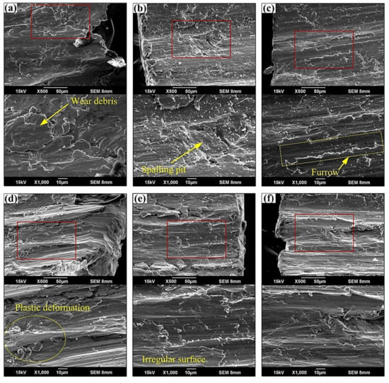 SEM micrographs of the wear surfaces with different morphology properties. (a–c) Relatively regular surface; (d–f) irregular surface.