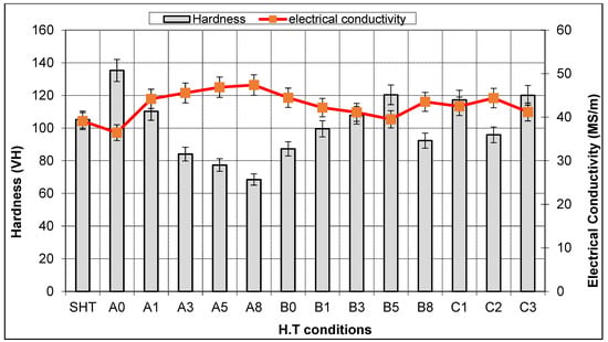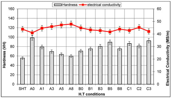 - The electrical conductivity values increase continuously with increasing aging temperature by applying T7 aging directly after T6 condition (T6/T7). In addition, there is a reverse relationship between electrical conductivity and hardness values as relating to different aging cycles applied in this study.