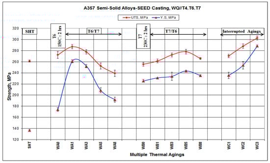 - The hardness results obtained after the T6 continuous aging treatment (WA0) of A357SSM alloys are not improved by means of T6/T7 aging (A) cycles. However, the application of T6/T7 aging (WA1) cycle and of T7/T6 aging (B) cycles improved the hardness and Tensile strength values compared to T6 under aging (WA0) and T7 standard over aging (WB0) conditions, respectively.