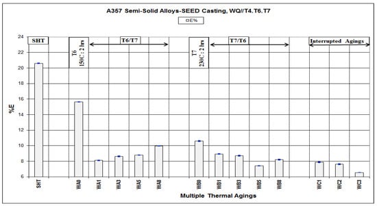 - The two steps thermal aging (WA1–8) cycles (T6/T7) indicated an improvement of ductility values by increasing the time of the second step of thermal aging.