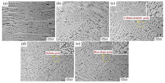 Figure 1 shows the microstructure with different isothermal treatment temperatures. The results in Figure 1 demonstrate that the isothermal treatment temperature has an impact on the microstructure. There are three different kinds of solidification microstructures, as shown in Figure 1. Typical microstructures of Figure 1a–c samples are the dendritic and coarsened grains, and dendrites have a certain orientation and grow along the direction of heat flow, whereas a typical microstructure of Figure 1d sample is the equiaxed, globular and non-dendritic grains. The typical microstructure of Figure 1e sample is the rose shape grain. When the melt is dealt with isothermal treatment in 1480 °C, some dendrites are rather coarse with a well-developed second dendrite arm. With the decrease of isothermal treatment temperature from 1480 °C to 1420 °C and 1410 °C, the well-developed second dendrite arm disappears. Meanwhile, there are some globular grains distributed in the dendritic grains. When the melt is dealt with isothermal treatment in 1400 °C, there are only the globular, equiaxed grains distributed in the solidification structure, and the average grain size is 60 μm. With the decrease of isothermal treatment temperature from 1400 °C to 1390 °C, several rose-shaped grains can be observed in Figure 1e.