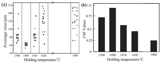 It is confirmed that the grains holding at 1400 °C are smallest with an average size of 68 μm, and the value of CSF is 0.95. The maximum and minimum size of grain holding at 1480 °C are 200 μm and 70 μm, respectively, and the value of CSF is 0.25. The maximum and minimum size of grain holding at 1420 °C are 170 μm and 60 μm, respectively, and the value of CSF is 0.40. The average size of grain holding at 1410 °C and 1390 °C is 90 μm, and the values of CSF are 0.55 and 0.72, respectively.