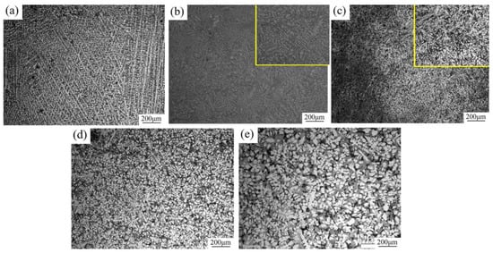 Effect of various isothermal treatment temperatures on the quenching microstructure of Ni-Cr-W superalloy: (a) 1480 °C; (b) 1420 °C; (c) 1410 °C; (d) 1400 °C; (e) 1390 °C.