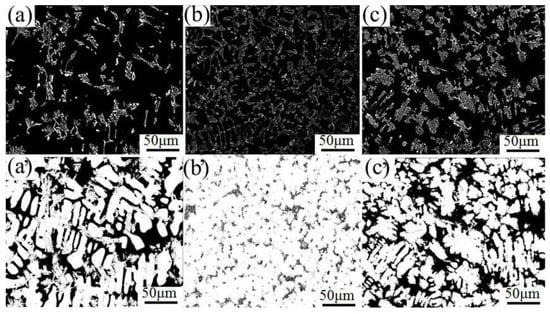 The SEM image after binarization processing isothermal treatment at various temperatures of Ni-Cr-W superalloy: (a) 1420 °C; (b) 1400 °C; (c) 1390 °C, (a–c) Eutectic; (a’–c’) γ phase.