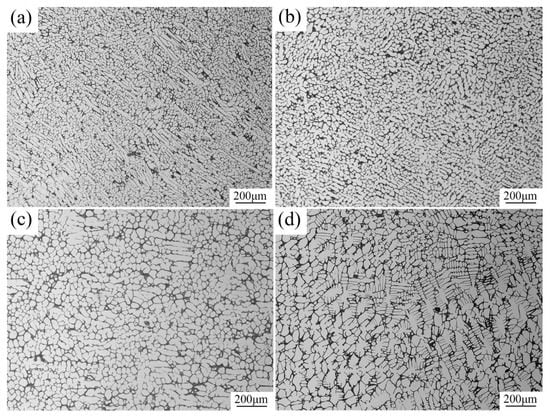 The result demonstrates that the sizes and shapes of the grain at the liquidus temperature (1400 °C) are homogeneous. In contrast, the sizes and shapes of the grain above and below the liquidus temperature are not homogeneous. It is universally considered that when the melt is dealt above and below the liquidus temperature, there is no cluster in the melt that serves as nucleation, at the same time, the temperature field becomes more unevenly []. These factors easily lead to formation of coarse dendrites. When the melt is dealt near the liquidus temperature, the melt temperature field becomes more evenly, which also makes phase fluctuation become small [,]. Meanwhile, the quantities of clusters increase in the melt and the distribution of clusters is more evenly. Uniform temperature and solute field allow more particles of a suitable size to be active in heterogeneous nucleation and restrict the growth of crystal []. This in turn benefits to the formation of equiaxed and non-dendritic grains.