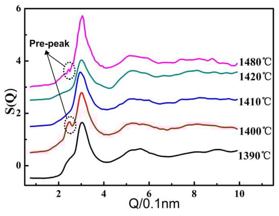As the temperature decreases from 1420 °C to 1390 °C, the intensity of the main peak gradually increases, and the disordering degree falls. There is no pre-peak on the structure factor curve at 1420 °C, 1410 °C and 1390 °C, as shown in Figure 9, and a clear pre-peak before the main peak exists on the curve of structure factor and original intensity of Ni-Cr-W superalloy at the temperature of 1480 °C and 1400 °C. It is universally considered that these pre-peaks are associated with MRO structure and intermetallic compound []. This MRO structure exhibits strong temperature dependence. To deeply illustrate the temperature dependencies of the MRO structure, Spre-peak/Stotal, the ratio of the pre-peak area (the integrated height of the original S(Q) curve, with Y = 0 as the baseline) to the total area of the S(Q) curve is adopted. The ratio of the pre-peak area at 1400 °C is considerably larger than that at 1480 °C, which indicates that the number of MRO clusters at 1400 °C is greater than that at 1480 °C. Meanwhile, two kinds of MRO clusters at 1400 °C and 1480 °C are different. MRO clusters at 1400 °C must be caused by the liquid/solid transition of the solidification process and intermetallic compound. Ni2Cr and Ni3Cr2 chemical compounds are formed near the liquidus in the Ni-Cr system, and such clusters can be regarded as “nuclei” of the matrix phase. This leads to the formation of fine grain microstructure, as shown in Figure 1d. First-order structural phase transition at 1480 °C may be due to carbides, because the Ni-Cr-W superalloy is a carbide strengthened alloy.