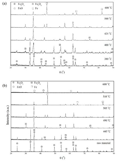 - Jozwiak, W.K.; Kaczmarek, E.; Maniecki, T.P.; Ignaczak, W.; Maniukiewicz, W. Reduction behavior of iron oxides in hydrogen and carbon monoxide atmospheres. Appl. Catal. A 2007, 326, 17–27. [Google Scholar] [CrossRef]