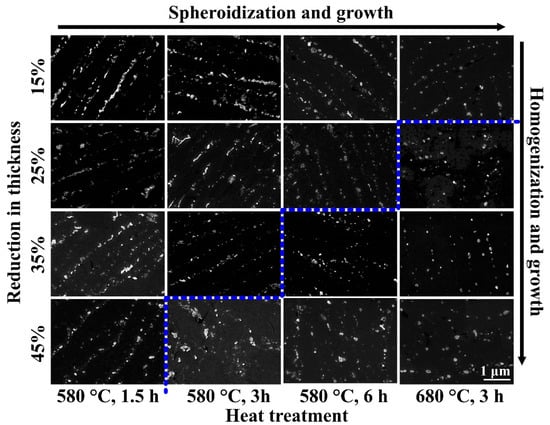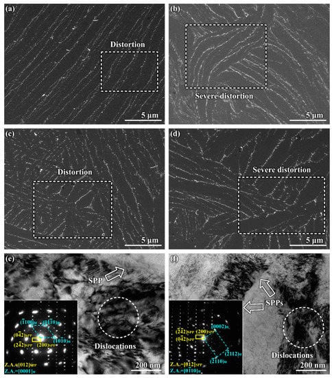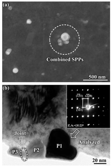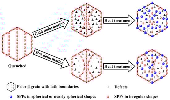 - A linear distribution of SPPs is presented in the quenched sample. After rolling, the distributions of SPPs in the samples are distorted to some extent, according to the deformation degree. The SPPs both in rolled samples are coarsened, spherized, and homogeneously distributed during annealing; the average diameters of the SPPs increase with increasing the deformation degree and annealing time (or temperature). Furthermore, compared with the cold-rolled–annealed samples, the emergences of the homogeneous distributions of the SPPs in the hot-rolled–annealed samples are postponed.