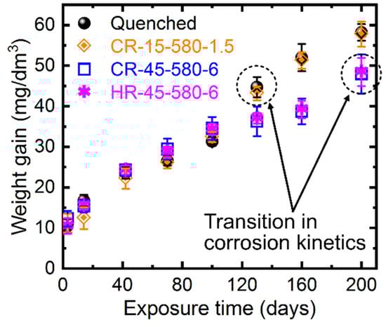 - All the selected samples had a similar weight gain before the 100-day exposure. However, the samples with inhomogeneously distributed SPPs had a post-transition phenomenon after the 100-day exposure, whereas the transitions in corrosion kinetics of the samples with homogeneously distributed SPPs took place after the 160-day exposure. Therefore, it confirms a detrimental effect of inhomogeneously distributed SPPs on the corrosion resistance of the Zr alloys.