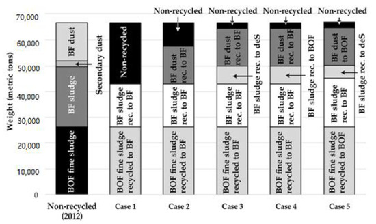 The reference case used in the process integration analyses was the present scenario of in-plant recycling at the two integrated steel plants in Sweden. The change in energy consumption for a fixed crude steel production was considered in different recycling scenarios. These scenarios are presented as the five cases shown in Figure 1. In the figure, the leftmost column presents the annual generation of non-recycled off-gas dust generated at the BF, deS station, and BOF. The process integration analyses were performed using the Excel spreadsheet-based model, TOTMOD. This model is based on the spreadsheet model Masmod, presented by Hooey et al. [21]. The BF, deS station, BOF, and upgraded method of BF sludge were included in the calculations. In addition, the calorific value of the BF gas and the consumption of gas in the hot stoves were considered. Furthermore, an estimation of the change in energy consumption corresponding to the reduced or increased charging rate of coke and pellets were included.