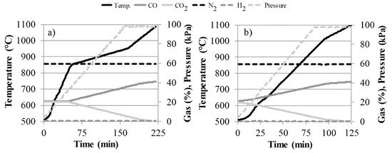 The reduction of the different briquettes in BF shaft conditions were studied using a laboratory-scale BF shaft simulation experiment. The equipment has been described previously by Robinson [25]. Two programs were run, one representing the descent of the briquette along the wall of the BF and one of the descent in the center. The two programs are depicted in Figure 2. A total gas flow of 50 Nl/min was used in the experiments. The mechanical pressure applied on the sample did not affect the total pressure of the gas phase, as shown in Figure 2.
