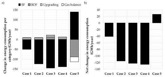 Figure 3a illustrates the change in energy consumption in the process system corresponding to the different calculation cases. By summarizing the effect of each individual process, the net change in energy consumption was calculated for each case, shown in Figure 3b. The net change consistently decreases from case one to case four. The energy savings stem from the decreased specific consumption of coke and iron ore pellets connected to the recycling of the iron and carbon in the residues. The most efficient decrease in the net energy consumption was calculated for case four, where a total decrease of 126 GWh/year was estimated.