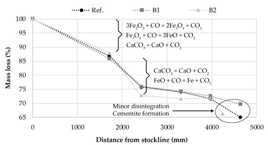 The mass loss of the three different briquettes with respect to the descent in EBF is presented in Figure 5. The reactions presented in the figure were based on the diffractograms of the briquettes at each location. Briquettes descending from the stockline to 1715 mm below the stockline was associated with the reduction of hematite (Fe2O3) to magnetite (Fe3O4) and magnetite to wüstite (FeO), and it the calcination of calcite (CaCO3) had also started. Reaching 2422 mm below the stockline, the calcination was completed and the reduction of wüstite to metallic iron had finished in all briquettes. All briquettes retrieved at and below 4246 mm below the stockline were partly broken. Also, cementite (Fe3C) formation was observed in all briquettes at these levels.