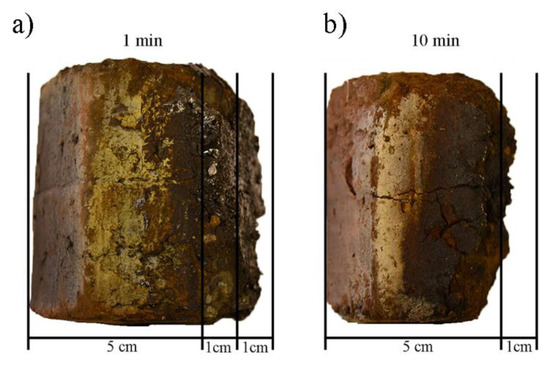 Photographs of the briquettes of Table 4 after contact with hot metal at 1350 °C for (a) 1 min, and (b) 10 min [30].