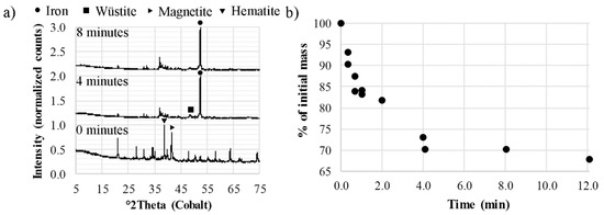 (a) Diffractograms of pellets with 100% peaks of the iron phases denoted; (b) mass loss of the pellets with respect to the time of contact with hot metal at 1350 °C [30].