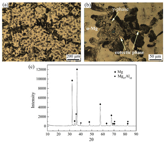 Optical micrographs of as-cast Mg-9Al-Zn (AZ91) alloy at (a) low and (b) high magnifications. (c) The corresponding X-ray diffraction (XRD) pattern.